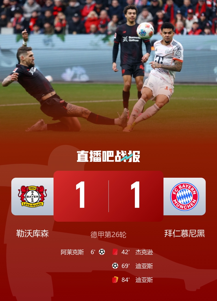 北京时间3月14日晚22点30分,2025-26赛季德甲联赛第26轮激情上演,勒沃库森在拜尔竞技场迎战劲敌拜仁慕尼黑。经过一场跌宕起伏的90分钟较量,最终两队以1-1握手言和,拜仁的七连胜纪录就此终结,仍以9分的优势稳居积分榜首。