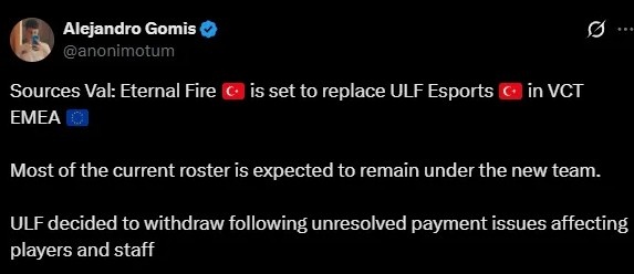 在ULF宣布退出后,另一家土耳其俱乐部Eternal Fire将接手其在联赛中的席位。据了解,Eternal Fire预计将保留ULF原有阵容的大部分选手。这一变动不仅影响了ULF的选手和管理层,也引发了对整个联赛管理和选手权益保障的关注。