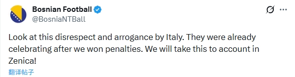 赛后,许多球迷纷纷在社交媒体上转发了这一视频,甚至有波黑的球迷对此表示不满,直言:“看看意大利球员这副傲慢无礼的样子,他们才刚刚赢下点球,就开始庆祝了。我们会让他们为此付出代价!”