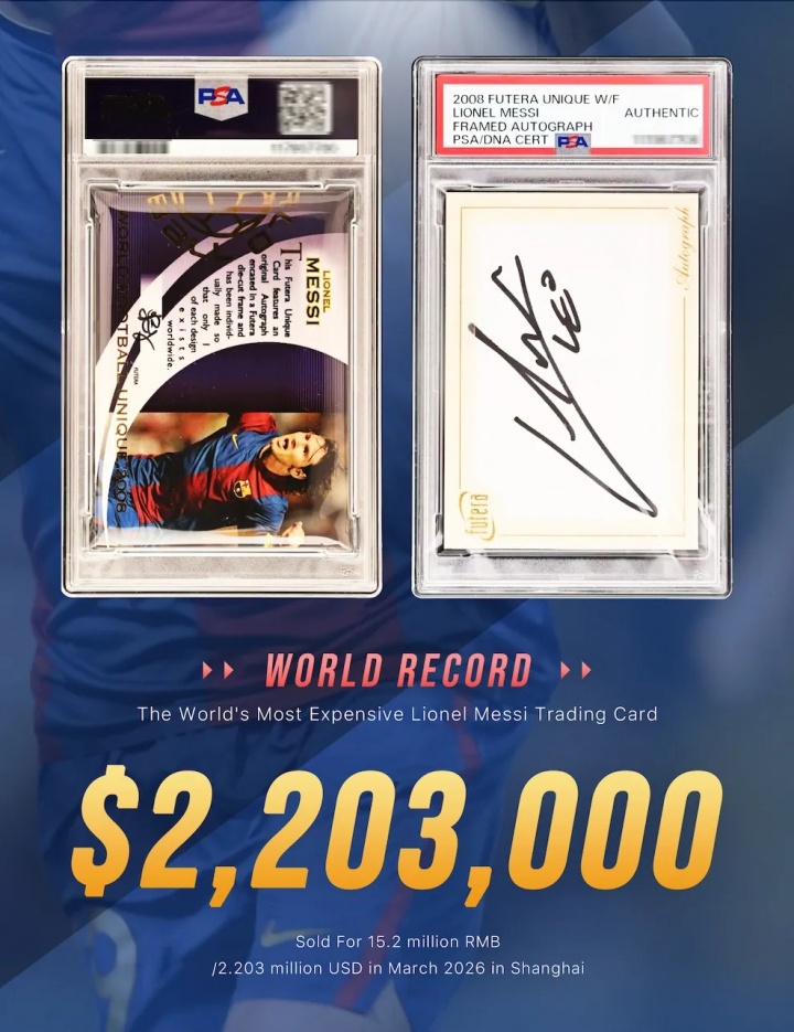 3月27日消息,梅西的一张签名球星卡在上海以惊人的1520万元人民币(约合220.3万美元)成交,创造了全球足球球星卡的交易新纪录。这张卡的价值在一年内激增,从最初的5万元涨幅超过300倍,真是让人咋舌!