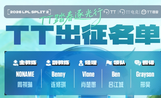 “春启新章,逐光前行。”在这样的口号鼓舞下,TT战队期待用最强阵容与拼搏精神迎接即将到来的挑战,做好全力以赴的准备,携手前进,追逐梦想。在2026LPL第二赛段中,我们有理由相信他们会在各大赛事中创造出更加辉煌的成绩。