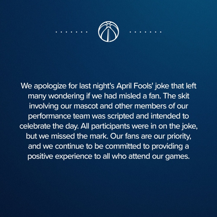 华盛顿奇才队今天发表了一份声明,诚恳道歉,为他们在愚人节时所策划的恶作剧引发的误解感到遗憾。这场恶搞事件让不少球迷感到困惑,也纷纷怀疑他们是否被误导了。声明中提到,这个小插曲涉及到球队吉祥物和表演团队的成员,意在以幽默的方式庆祝这一节日。尽管所有参与者都知道这是一个玩笑,但球队在处理这个事件时确实显得不够妥当。