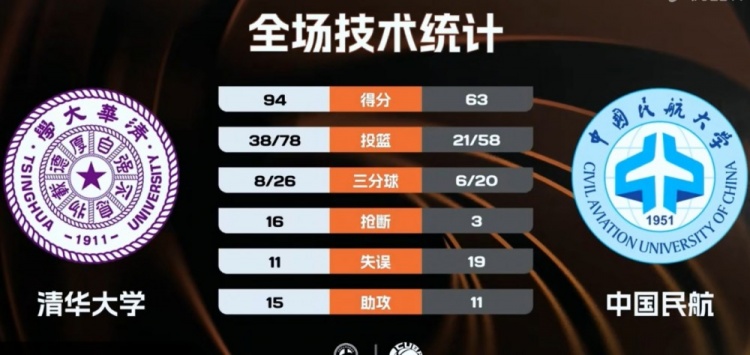 末节较量时,中国民航的进攻再次停滞,整整4分钟未能得分,清华大学趁机打出一波8-0的攻势,将领先优势扩大到近30分。虽然崔雍鑫终于打破得分荒,班步也在运动战中取得首分,但郑君豪立刻通过三分回应对手,最终清华大学以94-63大胜中国民航。