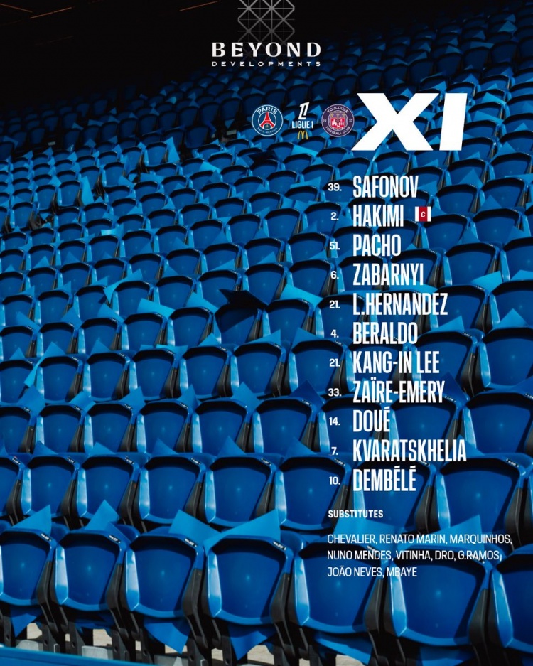 巴黎圣日耳曼的首发阵容如同艺术品一般,构建了一个力量与技艺并重的团队。门将萨福诺夫领衔防线,后卫阿什拉夫与扎巴尔尼肩负重任,共同守护大门。中场由李刚仁与贝拉尔多等人核心运作,联手演绎出流畅的传递配合。而前场的三叉戟——登贝莱、克瓦拉茨赫利亚与杜埃则如同利箭般,准备在对方防线中寻找破绽,以迅猛的进攻撕裂对手的防线。