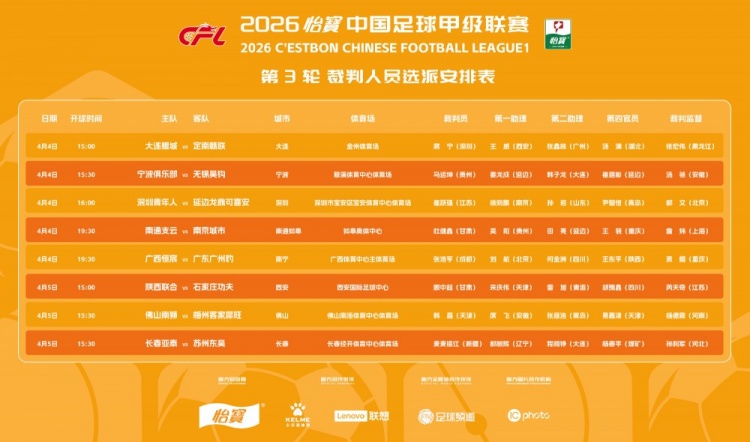 - 4月5日15:00 陕西联合对石家庄功夫,主裁判为顾中超;