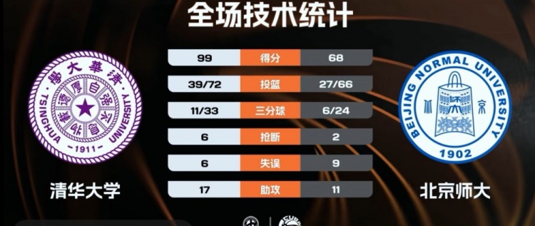 最后一节,郑君豪从外线连续命中三分,北师大在投罚方面努力支撑,刘庆闻罚球将分差拉开至30分以上,许熙桐接连的三分球更是为清华锦上添花。北师大在攻防两端显得无计可施,最终,清华大学以99-68的比分大胜北京师范大学。