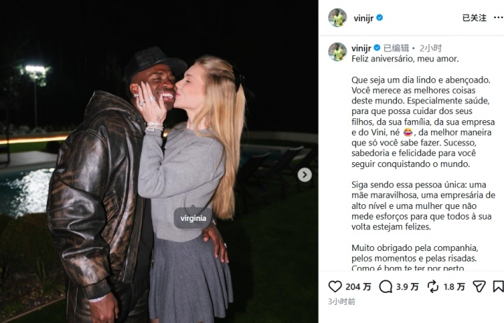 维尼修斯在社交媒体上庆祝了他的女友维吉尼亚的27岁生日,表达了对她的深情祝福。他在帖子中写道:“生日快乐,我的爱人。希望你今天能够拥有一个美好而充满祝福的日子。你值得拥有世上最美好的事物,尤其是健康,这样你才能照顾好我们的孩子、家庭、事业,以及我,对吧??愿成功、智慧与快乐继续陪伴你,助你征服这个世界。