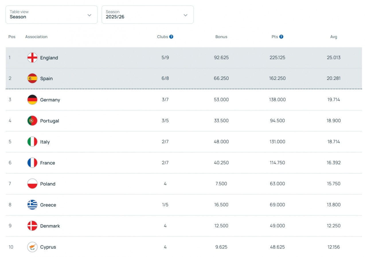 英超以25.013分高居榜首,西甲紧随其后,积累了20.281分,德甲的积分为19.714分,萄牙超级联赛则凭借18.900分反超了意甲。意甲不幸跌至第五,仅为18.714分。法甲在后,以16.392分位列第六,波兰超级联赛、希腊超级联赛、丹麦超级联赛和塞浦路斯甲级联赛分别以15.750、13.800、12.250和12.156分占据后位。