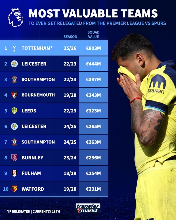 目前,热刺的市值达到八亿零三百万欧元,远远超过其他任何曾经降级的球队。倘若他们最终未能逆转局势,将以无可争议的身份被记录为英超降级之路上最昂贵的牺牲品。想想莱斯特城,在过去的赛季中他们的身价曾高达四亿四千四百万欧元,却经历了降级的命运。而南安普顿、伯恩茅斯和利兹联等队伍也曾经历过类似的苦涩,他们的身价在三亿到四亿之间徘徊,然而与热刺相比,这些都显得微不足道。