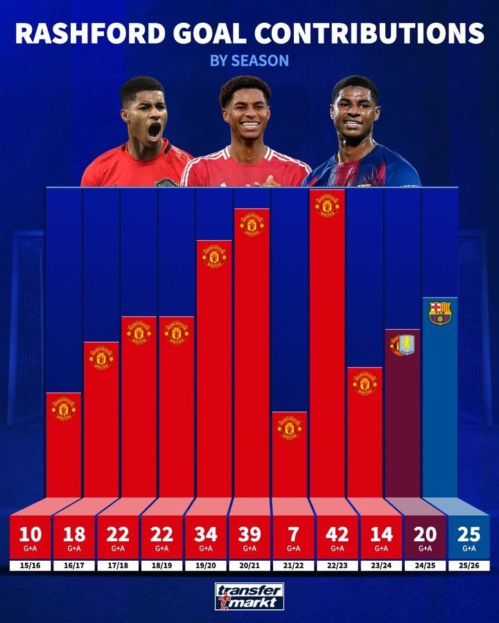 回顾拉什福德的职业生涯,每个赛季他为球队的贡献都非常显著。在2015-2016赛季,他在曼联的表现首次崭露头角,为球队打进了10个进球。随后在2016-2017赛季,他的进球数上升至18个,展现出他的不断进步。