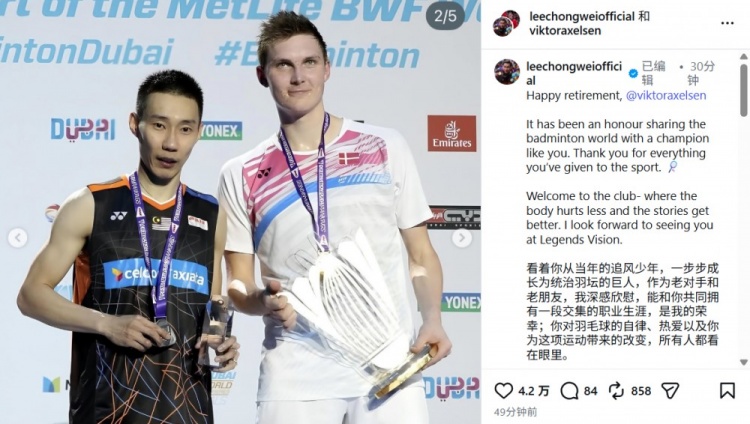 最终,李宗伟以一句“兄弟,我们 Legends Vision 见!”结束了这段深情的祝福,表明对安赛龙未来的期待和祝愿。安赛龙的退役标志着羽毛球界的不朽传奇落幕,同时也为后继者们树立了榜样,继续推进这项运动的发展。