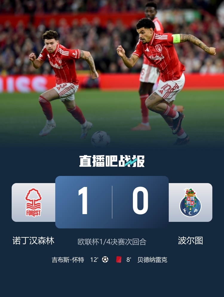 在4月17日的欧联杯1/4决赛次回合较量中,诺丁汉森林主场迎战波尔图。比赛在城市球场如火如荼地展开。上半场,波尔图的贝德纳雷克因蹬踏伍德被主裁判直红罚下,场面直接改变。此后,诺丁汉森林迅速利用人数优势,吉布斯-怀特在前场冷静施射,助球队取得领先,比分定格在1-0。